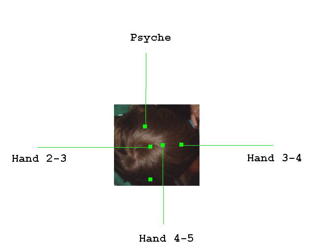 Handhauptpunkte auf dem Schädeldach. Die Wirkungsdauer der Behandlung dieser Schädelpunkte ist kurz (kann auch