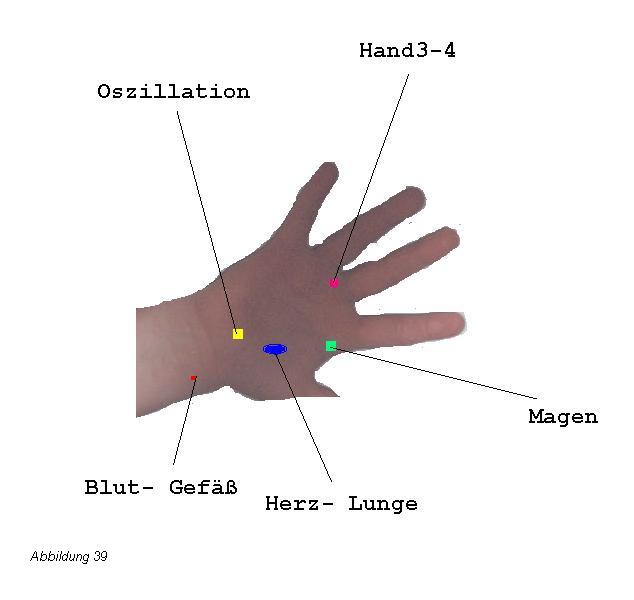 alle Handpunkte. Nach zusätzlicher peripherer und zentraler Auflage von Wasser kam der Blut- Gefäß- Punkt. Dies